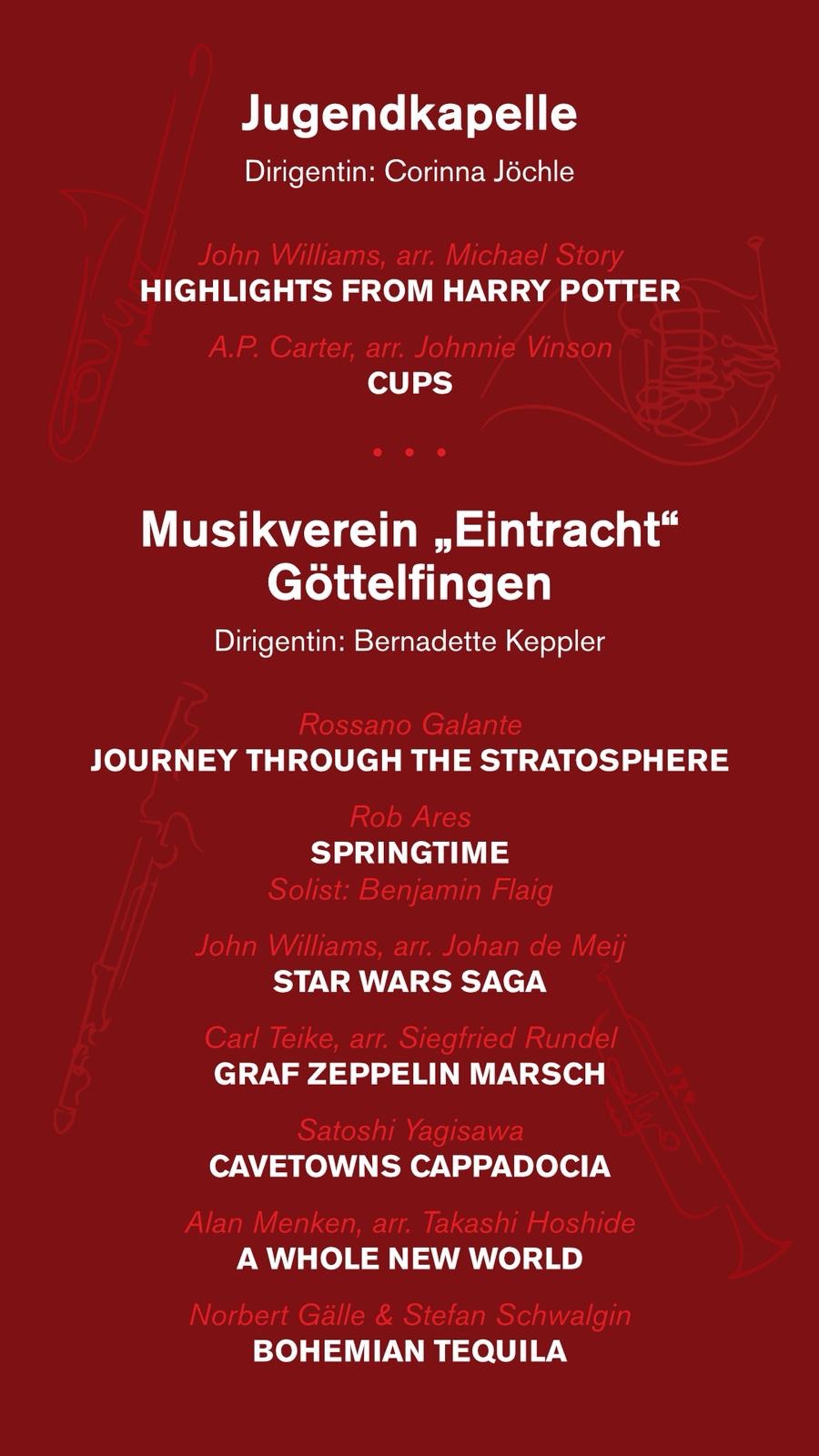 Der Musikverein „Eintracht“ Göttelfingen e.V. lädt herzlich zum diesjährigen Jahreskonzert ein. Freuen Sie sich auf einen stimmungsvollen Konzertabend mit einem abwechslungsreichen Programm aus traditioneller und moderner Blasmusik.